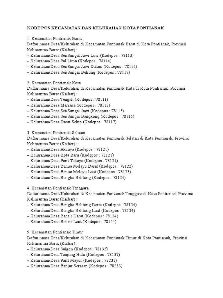 Kode Pos Kecamatan Dan Kelurahan Kota Pontianak
